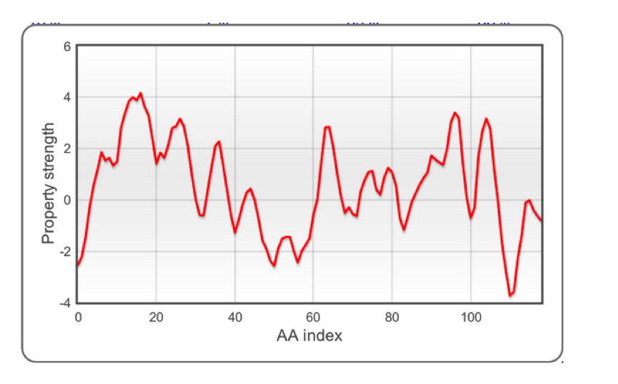 The very first step of algorithm operation is information extraction from protein sequences. A number of experimental scales (shown top right) are applied to individual protein sequences. Each amino acid (AA) in the sequence is then scored and turned into a profile: