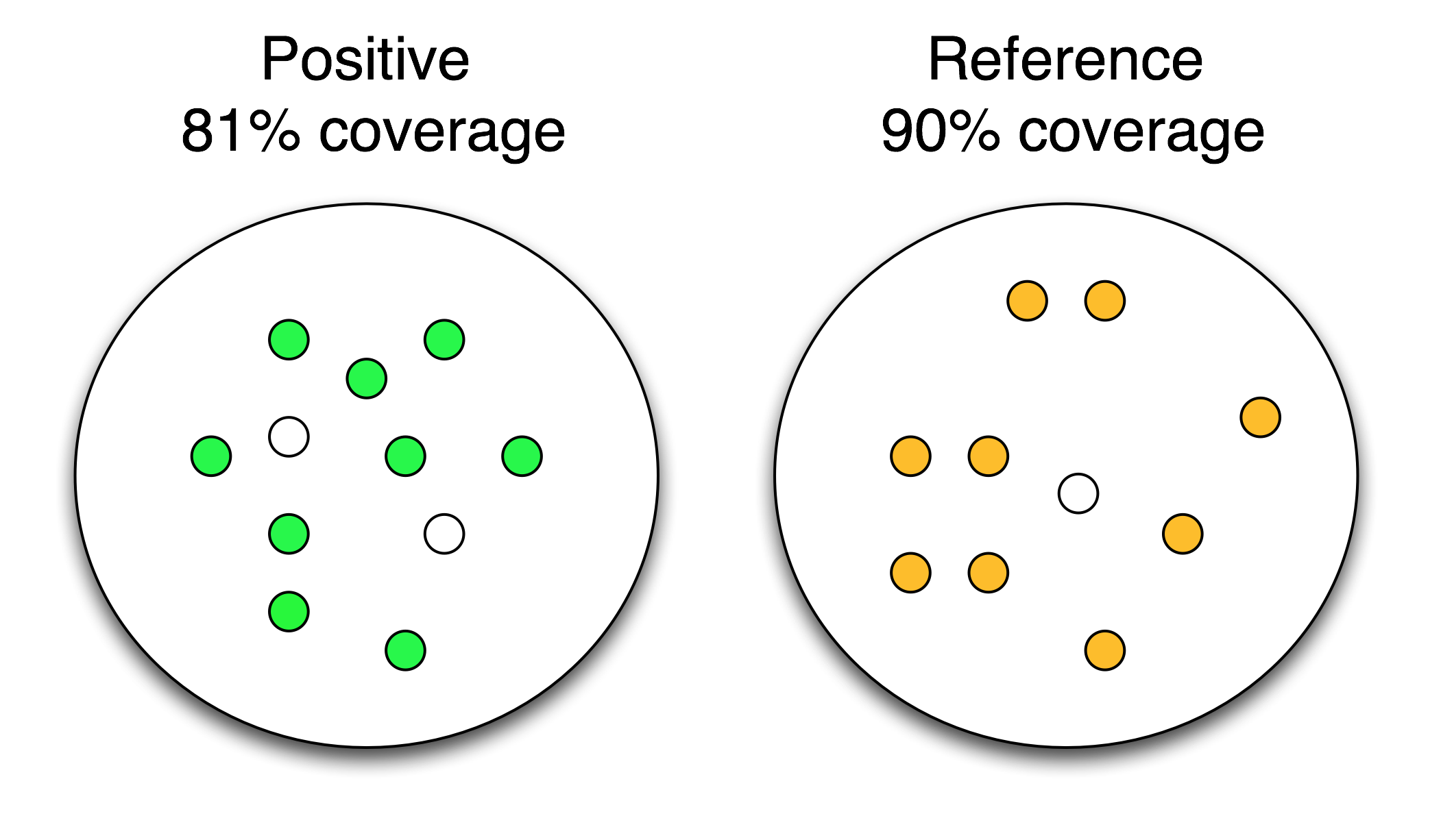 Dataset coverage is the strength of an individual physico-chemical property. The “coverage” measures the fraction of the input sets that can be separated by each property and represents the “discriminative power” of the algorithm. The larger the coverage is, the stronger the property is. The image illustrates a single-property result. The colour-filled elements represent entities selected by a scale while the white-filled ones do not exhibit strong-enough property. In this particular example, we can see that the property was strong and had a maximum coverage of 90%. The effect of a property is always oposite between the two datasets, and the number is automatically converted - if a property is positive on one dataset, it is depleted on the other. So technically, in this case all but the white one on the RHS were depleted but because there was strong signal on the Positive, coverage is automatically flipped on the reference.