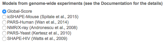 The user can choose between five different models, each trained on a dataset from one specific organism and technique. The datasets are described in the documentation section. Each selection allows the user to specify the model to predict the RNA secondary structure (RSS) propensity based on the specific characteristics of a technique or an organism: PARS on yeast (Kertesz et al. 2010), PARS on human (Wan et al., 2014), icSHAPE on mouse (Spitale et al., 2015), SHAPE on HIV (Watts et al., 2009). Due to the high quality of structural experiments, we added a model trained on NMR/X-ray data (Andronescu et al., 2008). The Global Score model is a consensus of these 5 models (see Documentation).