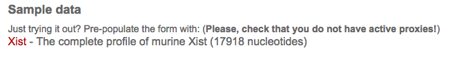 The form can also be pre-populated by clicking on the provided sample data at the bottom of the submission page. The algorithm will compute the complete secondary structure propensity profile of Xist in less than 1 minute using Global Score.