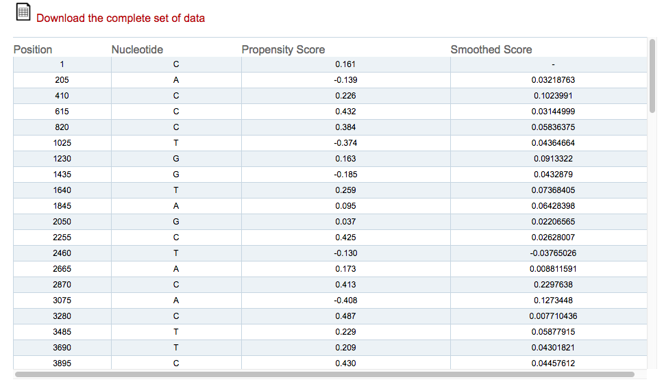 After the submission is completed, the algorithm processes the RNA sequences using the experimental model previously selected. For each sequence of length n the algorithm computes its secondary structure propensity profile at single nucleotide resolution, from nucleotide 7 to n-7. To calculate the scores for the first and last 6 nucleotides we employ periodic boundary conditions: we append a copy of the last 6 nucleotides at the 3’ end to the 5’ end and vice versa. The scores of the first and last 6 nucleotides are then calculated using fragments containing nucleotides from the respective other end. The predicted secondary structure propensity scores lie in the range [-1, 1]. A score in the range (0, 1] means that the nucleotide is predicted to be in a double-strand, while a score in the range [-1, 0) indicates that the nucleotide is single stranded. To generate a better visualization of the profile, we apply a length-dependent dynamic smoothing. A scrolling table shows a sample of the total nucleotides (depending on the smoothing window) with both the raw and the smoothed propensity score. The user can easily download the table with the complete data (raw and smoothed) by clicking the provided link. The symbol “-” indicates nucleotides outside of the smoothing window where the smoothed score is not available. Please refer to the raw propensity score for these cases.