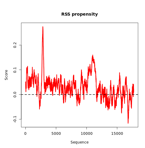To show the distribution of the RSS propensity scores, the algorithm generates a visualization of the profile using R. The profile is smoothened using a running mean with a dynamic window size linearly dependent on the length of the sequence. This image can be downloaded in PNG format.