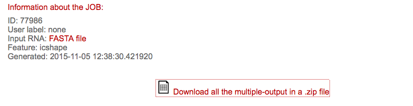 The user can also paste multiple RNA sequences in the form, however the output page will be slightly different. The webpage will show the link to download the output of the submission as a zip file (Submission.zip).