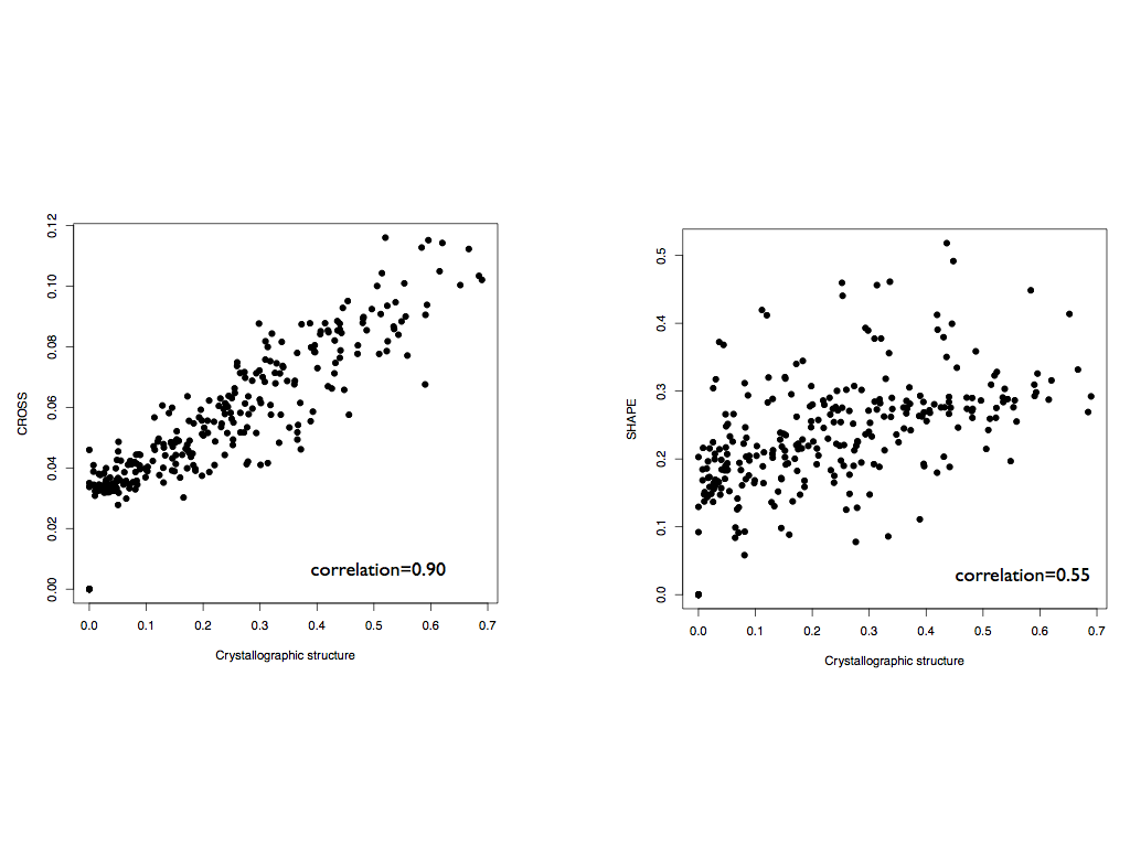 To test the performances and functionality of a predictive algorithm (CROSS) combined with a DTW algorithm, we selected a dataset of 22 structures with both SHAPE data and the crystallographic structures available (Lorentz et al., 2016). Using CROSSalign, we compared the structural distances between all possible couples in the dataset, using: 1) the crystallographic profiles (dots and brackets become 0 and 1), 2) SHAPE data, and 3) CROSS predictions. CROSS not only shows a high correlation with the crystallographic data (correlation 0.90) but also a better correlation than SHAPE. These results validate CROSS a valid alternative to real crystals inside a DTW algorithm.