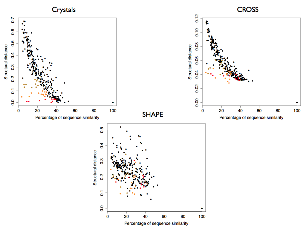 Moreover, the correlation between the structural distance from the crystals and the similarity of the primary sequence is 0.57, higher enough to show an important contribution from the sequence similarity in order to explain secondary structure similarity, but not enough to associate sequence identity with structural identity. Crystallographic data and CROSS profiles allow the identification of specific clusters of RNA molecules with low sequence similarity and high structural similarity (colored in red, orange and green). Interestingly, SHAPE data combined with DTW are not able to identify these clusters and the structures contained.