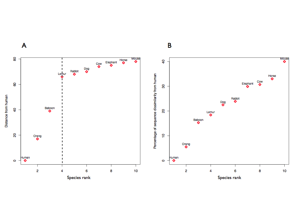 We used CROSSalign to study the structural similarities of the RepA of Xist in 10 different species (Maenner et al., 2010). Observing how different is the RepA of each species from the RepA-Human, we can see that the primates tend to cluster closer to human (A; structural distance x100), as expected, while the other species show a similar, farther structural distance. A similar result can be observed building the distance from human using the percentage of sequence dissimilarity (B; 100-sequence identity %). In this case, however, the RepA of each organism is linearly different from human, without a specific cluster. This analysis suggests that the RepA is conserved in term of secondary structure specifically among the primates, and is more conserved in structure than in sequence.