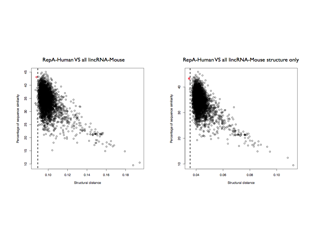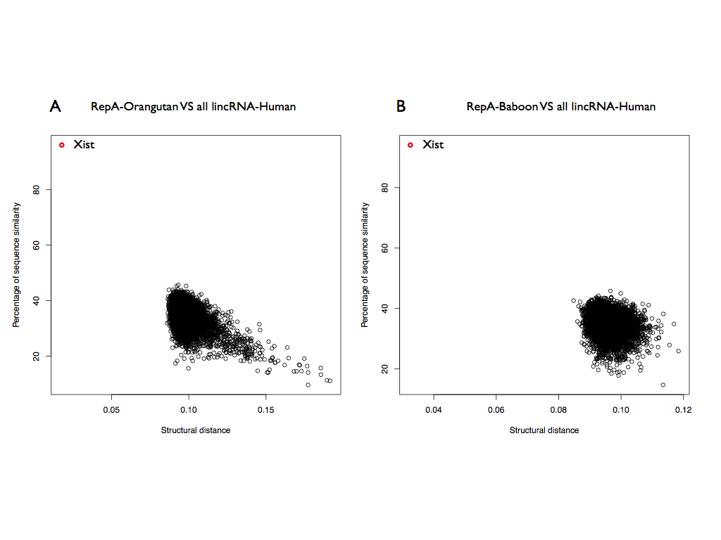 To further investigate these results we selected the RepA of Orangutan and we searched the structural similarities in all the human lincRNAs (8176; ENSEMBLE 82). Xist is the best significant match between all the lincRNAs (structural distance 0.01; p-value < 10-6) and also in this case the Rep A is correctly identified (predicted coordinates: 328-764). This result is further supported for the RepA of Baboon (best result: 0.032) and Lemur (best result: 0.074) against all the human lincRNA, suggesting a structural conservation inside the primates.