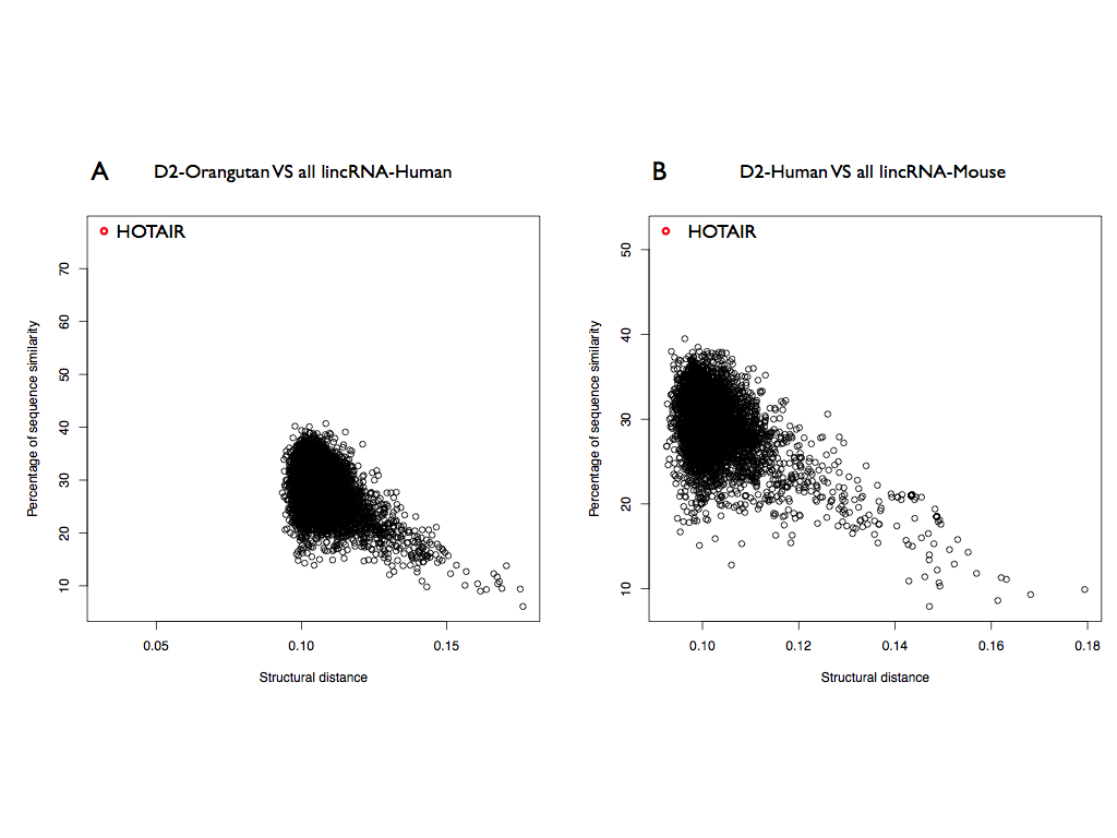 We selected the domain D2, the most structured domain of HOTAIR according to CROSS predictions, to see if is conserved and if we are able to find structural homologi. The D2 of Orangutan was then searched in all the human lincRNAs and HOTAIR is the best result with a significant score (structural distance 0.032; p-value < 10-6) as well as correctly identified in the sequence (predicted coordinates: 666-1191). Interestingly, also selecting D2-Mouse in all the lincRNAs of human HOTAIR is the best result with a significant score (0.092; p-value < 10-4) and also the coordinates are well predicted (coordinates: 284-788; Figure 6b). These results show that the secondary structure of D2 is not only is conserved in the primates, as well as for Rep A, but also in mouse.