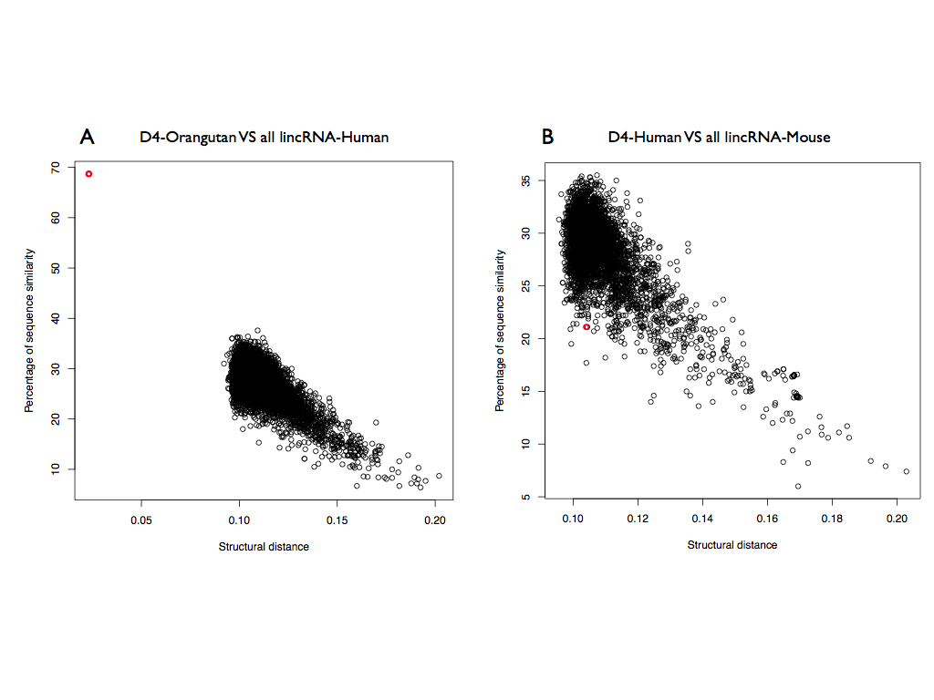 To further investigate the secondary structure of HOTAIR, we selected the domain D4, the region least structured according to CROSS. Surprisingly, D4-Orangutan is the best results among the human lincRNA (structural distance 0.023; p-value < 10-6), as well as correctly identified in the sequence (predicted coordinates: 1650-2291), showing the expected structural homology between human and primates. Instead D4-Mouse is the 1849th results for human HOTAIR (structural distance 0.104; p-value = 0.061) showing no structural homology between human and mouse.