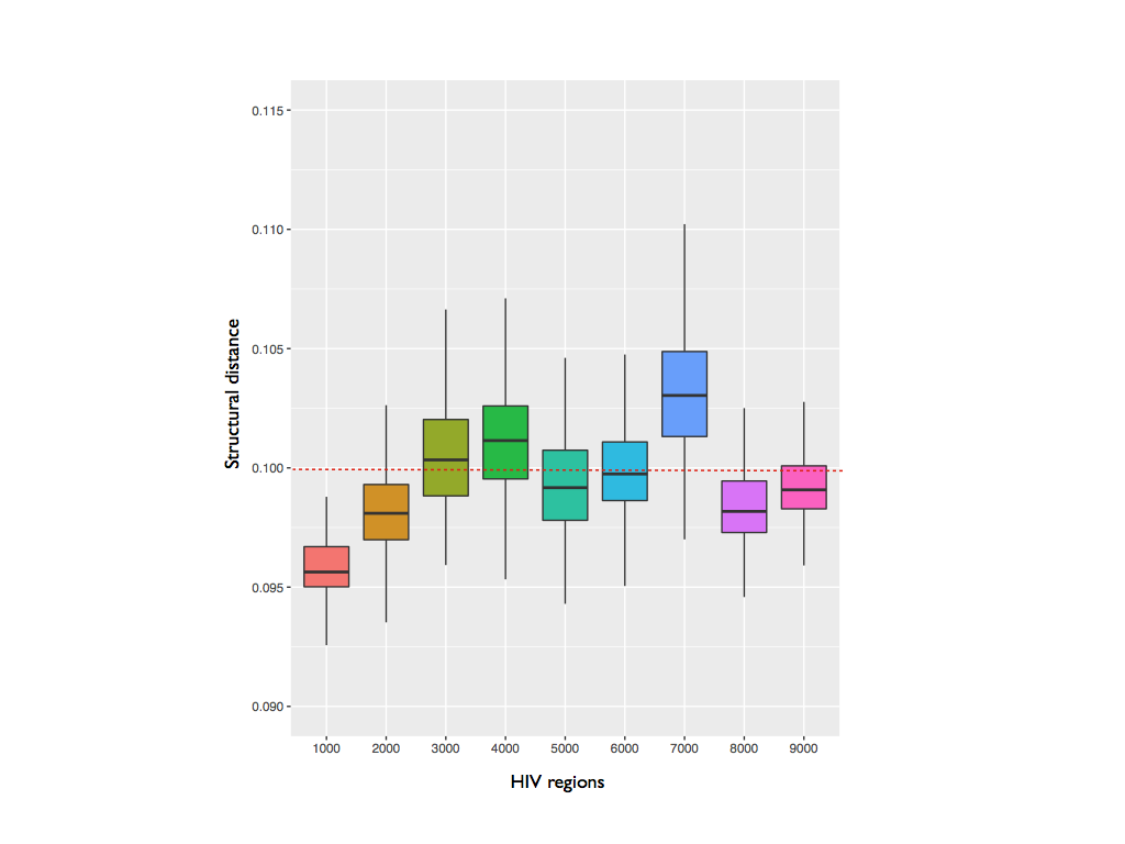 HIV is one of the most studied viruses and its secondary structure was analyzed and characterized (Watts et al, 2009). We divided HIV in not overlapping domains of 1000 nucleotides. All the domains were searched against the ss-RNA viruses having as host human, or in some cases primates (292 cases, downloaded from NCBI), in order to find some regions of structural homology. Our results suggest that the 5’ UTR is the region most conserved along all the viruses. This result can indicate that the secondary structure of this domain is not important only for the encapsidation of HIV, but can be a fundamental structural domain essential for the activity of all the viruses.