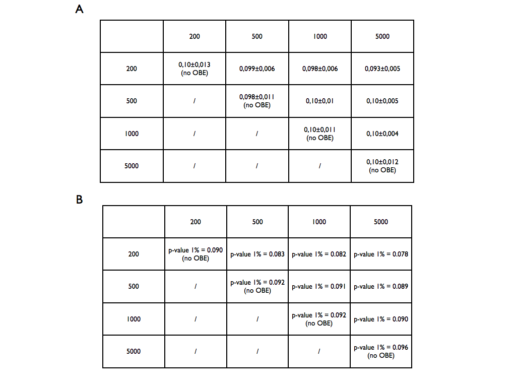 To compute the p-values we used existing human lincRNAs of different lengths (200, 500, 1000, 5000). Using ~100 molecules for each class, we computed the structural distance between all the couples of every comparison-size (~10’000). The obtained distributions were used as reference set to compute the p-values for a new case. The lengths of a submitted couple will be compared with the closer length of the reference set. The p-value will be then computed comparing the scores more significant than the target on the entire reference distribution. In the tables below are reported a) the mean and the standard deviation of the reference distributions and b) the score corresponding to the p-value significant at 1%.
