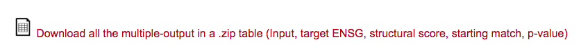The output can be downloaded in a .zip file selecting the specific link. The table has the same format and characteristics of the one obtained using fragmentation. The only difference is that each match is between the input and all the lincRNAs of the specified organism.