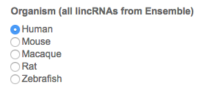 The organisms available are Human, Mouse, Rat, Macaque and Zebrafish. The lincRNAs where downloaded using Biomart (Ensemble 82). New organisms and updated versions will be regularly added.