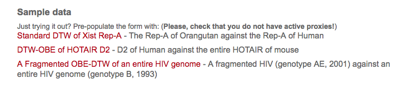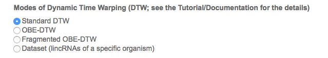 OBE-DTW (open begins and ends) is a specific mode to search a smaller profile inside a bigger one. This is the recommended modality when comparing profile of very different sizes. Please keep in mind that the sequence inside the form RNA input 1 will be the one searched inside RNA input 1, so the sequence in RNA input 1 should be smaller than the other. We advice to use OBE-DTW when one of the two sequences is at least > 5 times longer than the other.