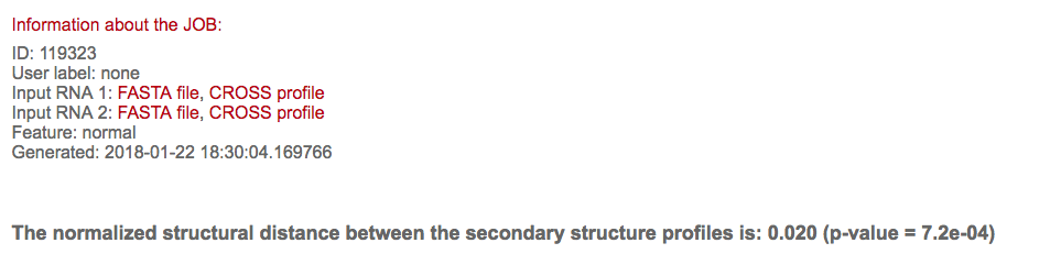 The main output is the structural distance, the overall value establishing the similarity between the two input structures. The closer the distance is to 0, the higher the similarity in term of secondary structure, where 0 means identical structural profiles. According to our analysis, RNA molecules with a structural distance of 0.095-0.10 or higher are to be considered different in term of secondary structure.