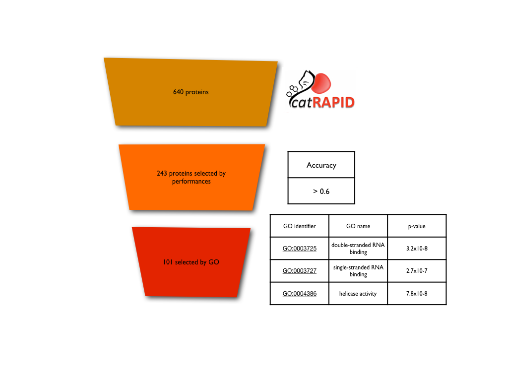 We used catRAPID to predict the interaction of several regions from 640 RNA-binding proteins (Agostini et al. 2013) with 200´000 double/single-stranded in vivo RNA fragments (a total of 128 millions of interactions). The protein regions were firstly selected for their ability to discriminate single and double-stranded RNA using icSHAPE data (Accuracy > 0.6). We found that the dataset was enriched for proteins with GO related to RNA structure and further selected cases with strong signals.
