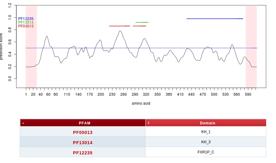 As shown in the following example of Fragile X Mental Retardation Protein (FMRP) our method correctly identifies RDs (two central KH domains and RGG box at 527-552 amino acids) as well as a novel RD at the N-terminus. Importantly the N-terminus interacts with RNA (Myrick et al., 2014) but it is not annotated in PFAM. Also, the RGG box is known to have an accessory role in RNA binding (Bagni et al, 2005) and shows lower propensity scores.