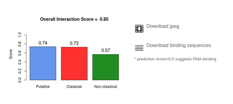 In addition to the overall score, three classifiers are used to assign specific propensities to the Classical, Non-classical and Putative categories. The classifiers have been trained on individual datasets. The division in RNA-binding categories is provided in the Supplementary of Kwon et al., 2013. The scores are visualized in a bar-plot at the bottom of the page. The scores range from zero to one and reflect the propensity to be associated with one of the classes. The user can download both, the plot of the detected binding regions and/or the respective amino acid sequences in FASTA format.