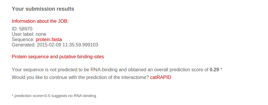 After the profile calculation, a binary classifier (Pedregosa et al., 2011) assigns an overall score to the sequence, indicating whether the submitted protein is RNA-binding or not. The overall prediction score is shown at the beginning of the page and ranges from zero to one. If the submitted sequence produces an overall score lower than 0.5, indicating no RNA-binding activity, the server stops with the analysis. The example below refers to a non RNA-binding protein (Castello et al.; 2012).