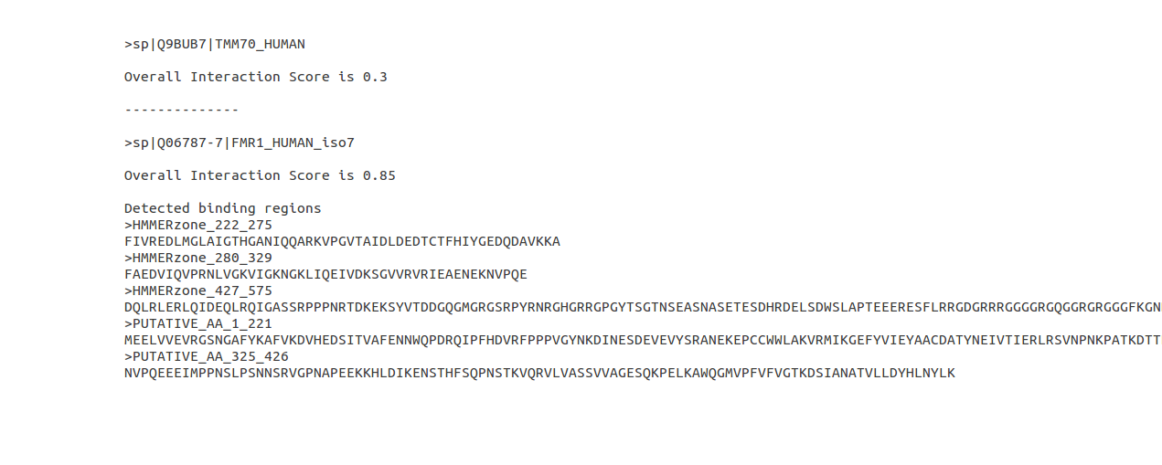 The file contains the interaction score for all the submitted proteins and the detected binding regions.