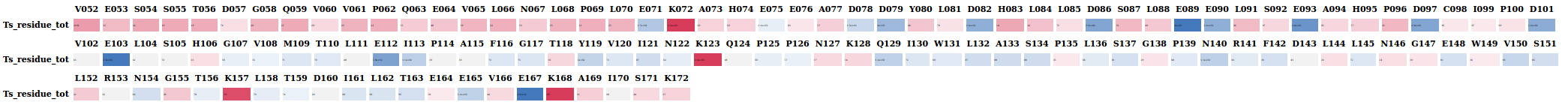 An interactive table with the values of the Tsi descriptor for each residue of the submitted protein. Colors span from blue to red as the descriptor increases. Above each cell, the specifics of the residue are reported, i.e. residue number, residue type (one letter amino-acid code) and protein chain. Displayed values are obtained using the total interaction energies as weights for the RIN links. The whole table with data for also only Coulombic energies and Lennard Jones ones is provided in the downloadable zip folder.