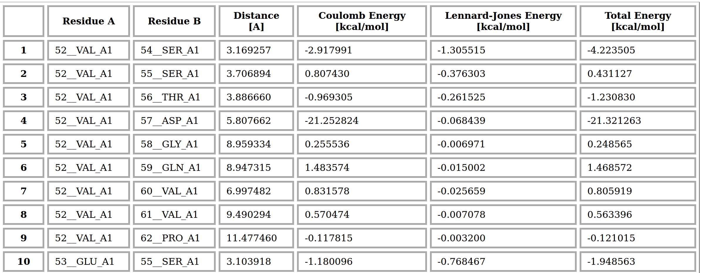 At the end of the output page, we reported the contact matrix of the RIN associate to the submitted protein in table format. In particular, each row of the table contains the key information about a couple of nodes (residues) found in contact. In particular, column ‘Residea A’ and ‘Residue B’ indicate the couple of residues, identified by the residue numbers, amino acid 3-letter code and chain. The ‘Distance’ column contains the distances (in Angstrom) between the two nearest atoms to the residues. Finally the last three columns report the values (in kcal/mol) of the interaction energies (network link weights) of Coulomb (C) , Lennard-Jones (LJ) and Total (C+LJ) between all the atoms of the considered residues. Only couples of nodes whose distance is smaller than 12 A are reported. The complete table is also provided in the output zip folder.